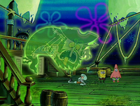 Squidward proceeds to complain almost this, and then the annoyed Dutchman tosses him into the Fly of Despair, a zipper-like portal leading to a cluttered dimension. Watching their screaming friend disappear in the unknown realm, SpongeBob and Patrick are frightened into submission, helping the Dutchman in his quest to terrorize the citizens of Bikini Bottom. However, the pair's idea of terror proves incompatible with the Dutchman'due south, so the ghost reveals that they won't be his crew. SpongeBob asks if they will be released, but the Dutchman states his true nature of informing them that they will be eaten as their advantage. Locked in their room, SpongeBob and Patrick's simply artery of escape is the dreaded "perfume section." Surviving this ordeal, they manage to steal the Flying Dutchman's dining sock, which they overheard that he cannot eat without.